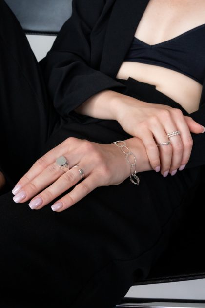 Bransoletka srebrna z dużymi ogniwami to mocny, a zarazem ponadczasowy akcent w każdej stylizacji. Ręcznie wykonana ze srebra próby 925, zachwyca prostotą formy i surową elegancją. Każde ogniwo ma młotkowaną fakturę, dzięki czemu oczarowuje blaskiem. Duże, łączone ze sobą ogniwa tworzą formę, która nie potrzebuje towarzystwa innych ozdób – sama w sobie stanowi mocną i wyjątkową całość.