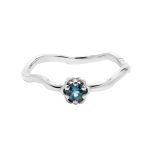 Ten pierścionek srebrny mały kwiatek z topazem BLOSSOM to biżuteria, która zachwyca detalem. jego forma została ukształtowana ręcznie – dzięki temu każdy egzemplarz ma swój indywidualny charakter. Nieregularna faktura srebra sprawia, że pierścionek wygląda jak naturalnie wyrzeźbiona, a niebieski topaz w centrum dodaje mu świeżości i lekkości.