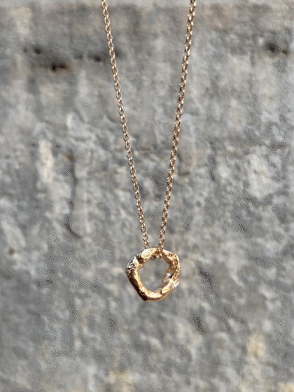 Wybierz pozłacaną biżuterię o rzemieślniczym charakterze, która doda blasku każdej stylizacji. Naszyjnik o nieregularnej strukturze, wykonany ze srebra próby 925 pokrytego złotem, zachwyca swoją organiczną formą i miękkim połyskiem. Możesz nosić go samodzielnie lub łączyć z innymi łańcuszkami i chokerami – w każdej wersji wygląda wyjątkowo i subtelnie podkreśla dekolt.