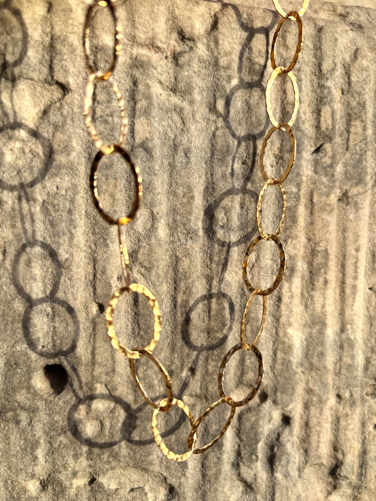 Jeśli szukasz biżuterii, która od razu przyciąga wzrok, a jednocześnie zachowuje minimalistyczny charakter, pozłacany choker z dużych ogniw będzie idealnym wyborem. Młotkowane ogniwa pokryte grubą warstwą złota subtelnie połyskują, dodając całości wyrazistości i elegancji. Nieregularna faktura sprawia, że naszyjnik ma niepowtarzalny charakter.